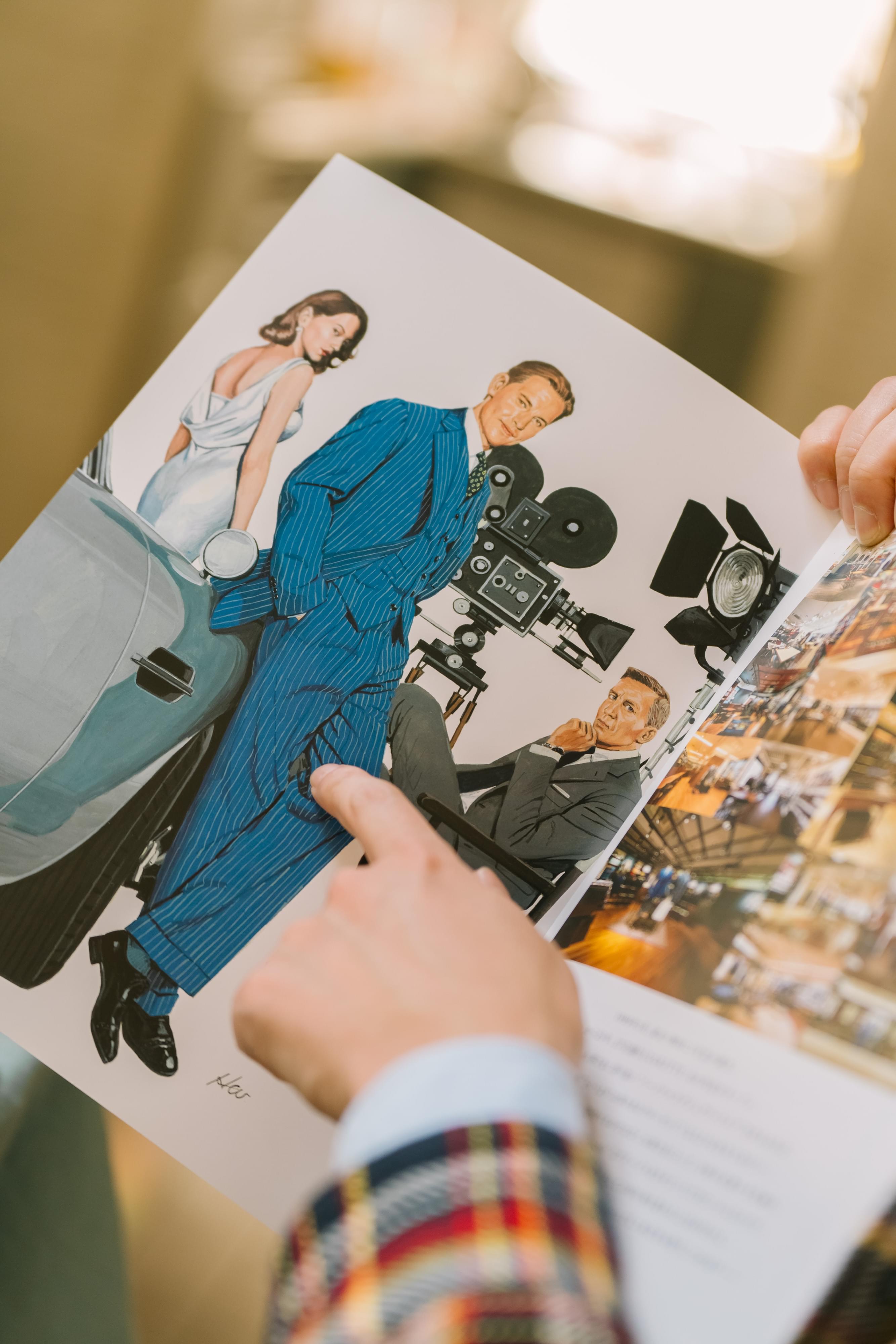 最近は麻布テーラーのシーズンテーマに沿って描いて欲しいというオーダーだから、ずいぶんリアリティある世界になってきたけれどね。あ、これはロンドンオリンピックの時に描いた絵だね。林信彦が女性を伴って映画「007」の撮影現場に遊びに来たというシーン。だから後ろにいる男性を、少しダニエル・クレイグに寄せているんです。