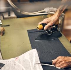 およそ300もの工程を費やして完成するスーツ。パンツの生産を外注する工場も多いなか、麻布テーラーではすべてを自社一貫製作しています。要所となるところには手縫いも用い、本格派の仕立てを継承。