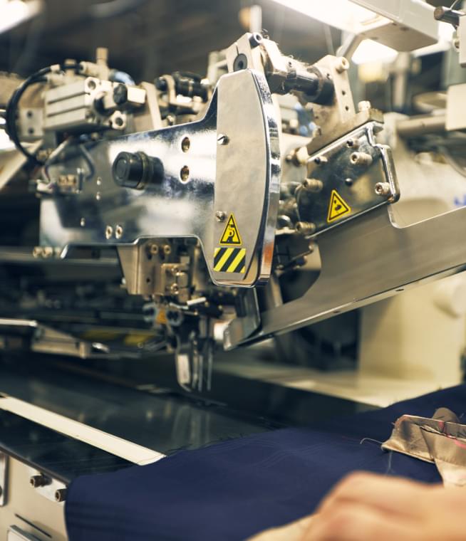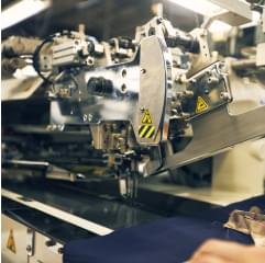 昔ながらの手仕事を堅持する一方、必要とあらば先端テクノロジーも柔軟に取り入れる。クオリティーを効率的にアップすることができれば、固定観念をもつことはありません。写真は、身頃の内側を正確無比に縫い上げる最新機械。これによって、ファクトリーのパフォーマンスは一段と向上しました。人機一体。適材適所。そんな哲学を掲げながら、創設半世紀超のファクトリーは日々アップデートを重ねているのです。