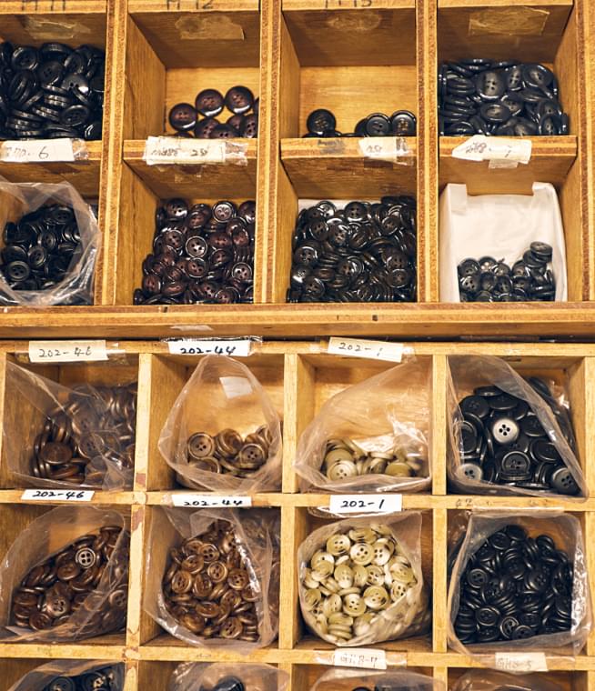 麻布テーラーで仕立てるスーツは目に見えないところまで千差万別。服の内側に据える芯地の選択も、お客さまのご要望に応えるためさまざまに異なります。立体美を強調するスーツには肉厚な芯を。軽快さを追求するスーツには極力薄い芯を。レシピを確認しながらストックに手を伸ばし、最適な材料を選びます。それは糸一本、ボタン一つまで同様。一着ごとに、すべての材料を替えていきます。作るのに機械こそ使えど、ちゃんと人の手を使った作業なのです。