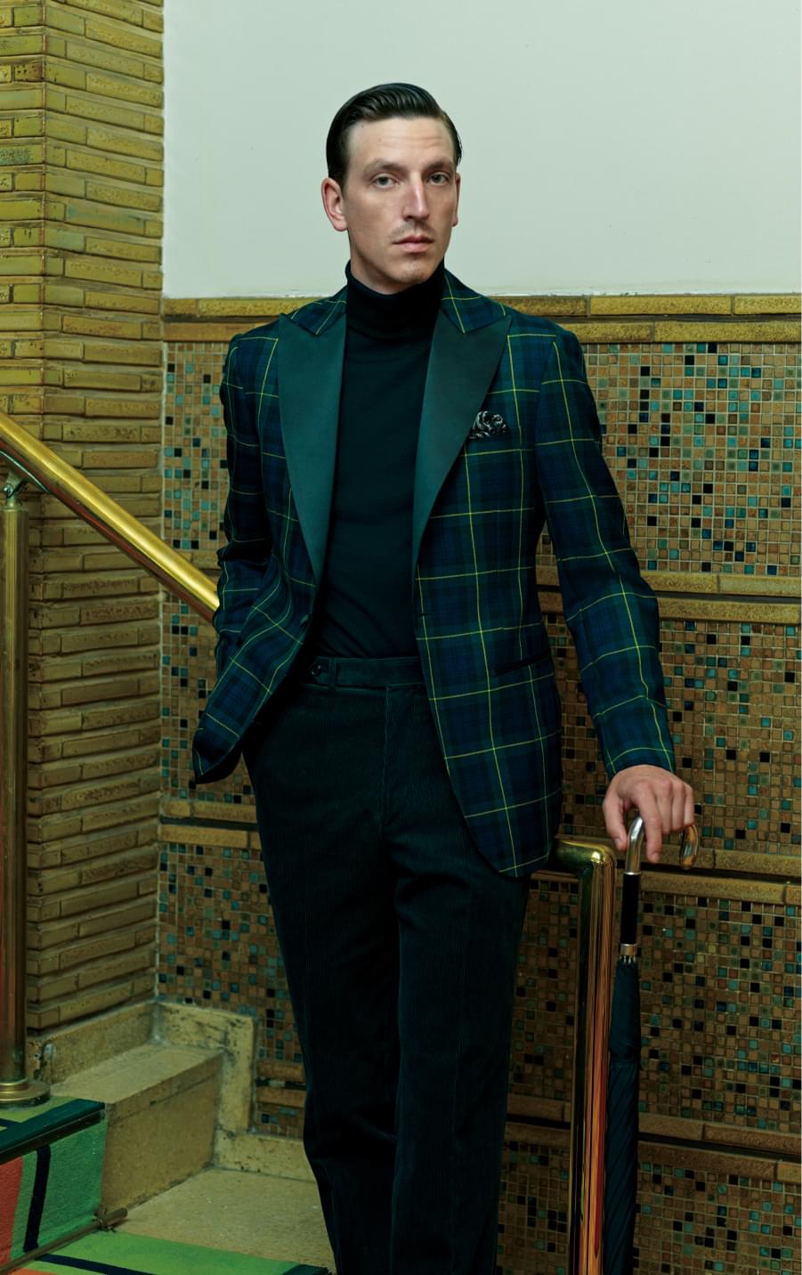 イエロー交じりのタータンチェックを、ブラックのセーターがモダンに引き立てます。