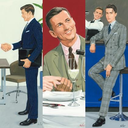 低めのゴージラインと、適度に広さを持たせたラペル、シェイプやボタン位置を低く設定することで、落ち着いた雰囲気を表現した「コンチネンタル」モデル。