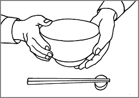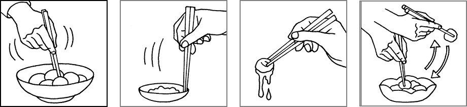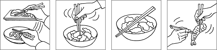左から、皿の上で箸をうろうろさせる「迷い箸」、箸で器の中を掘り起こす「探り箸」、皿の上に箸を渡して載せる「渡し箸」、箸から箸へ食べ物を渡す「移し箸」。