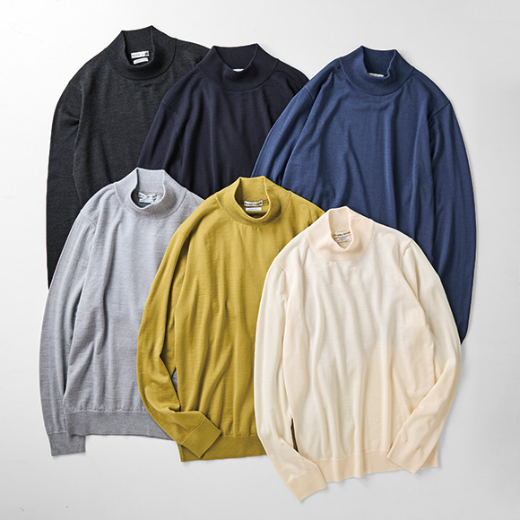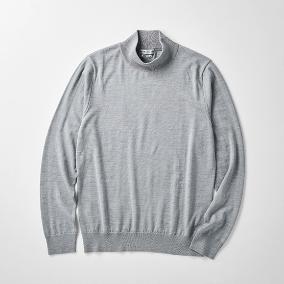近年、インナーニットの定番として定着したモックネック。適度なボリューム感と絶妙な高さになるようにパターンを工夫しています。天幅を若干広げ、前下がりも通常より下げています。襟幅も研究し、絶妙な高さを計算しています。このこだわりにより、スーツやジャケットのインナーにした時にエレガントさを損ないません。 ¥19,800 全6色(グレー / マスタード / エクリュ /チャコールグレー/ ネイビー /ブルー)