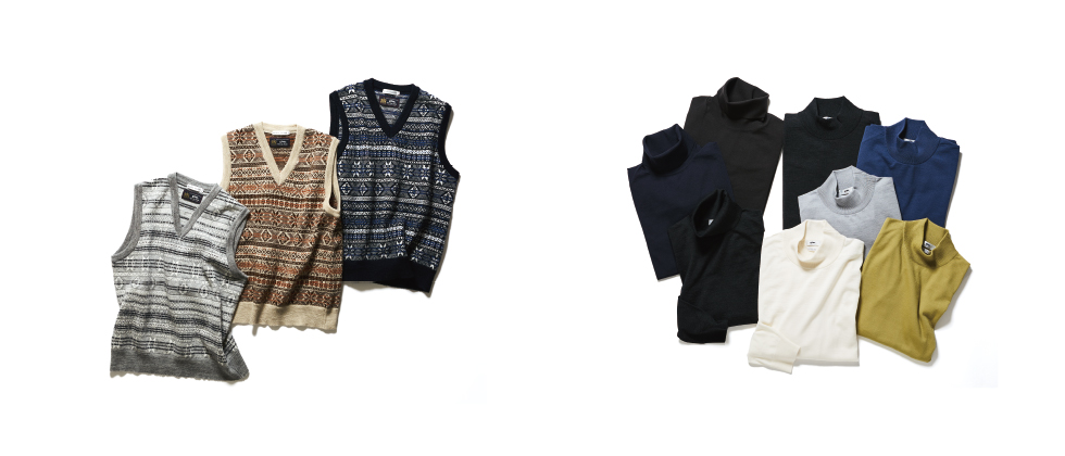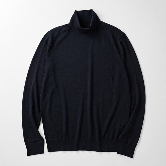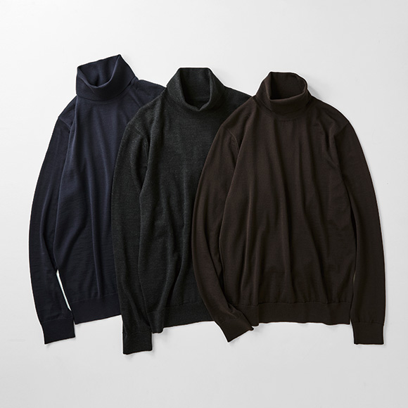 着用時、折り返した時の着心地とシルエットの絶妙なバランスを追求しています。ネックの高さを若干短く、天幅は若干狭く、その代わりにスパン糸を入れて、タイトにすっきり見えるようにしつつ窮屈感のないように工夫しています。このこだわりにより、スーツやジャケットのインナーにした時にエレガントさを損ないません。 ¥19,800 全3色(コゲチャ / ネイビー / チャコールグレー)