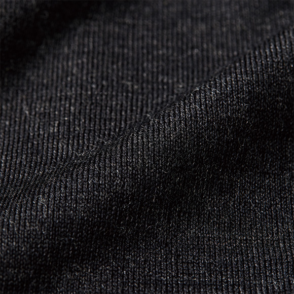 国内に数台しかない天竺編み専用の編み機で、スーツでいうスーパー140’Sに相当するこの繊細な極細糸をニット用に編み上げています。インナーニットとして、着用したときの美しいシルエットを実現する為に、身幅、肩幅を若干タイトにアームホールも若干狭くして、着用時にすっきり見えてそれでいて着心地のよいフィット感を追及しました。