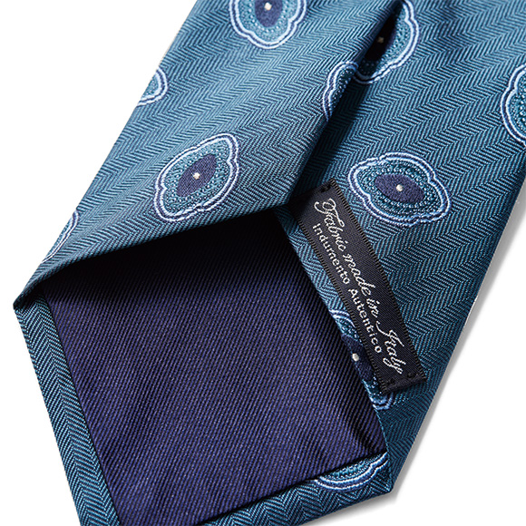イタリア製生地を使用し、日本国内の老舗ファクトリーにて縫製を行う Fabric made in Italy コレクションは、大剣裏の織ネームが目印です。イタリア生地特有のネクタイの織組織とよこ糸のカラーに合わせてたて糸を選んで織り上げられることにより、ネクタイのベースカラーに色の深みが増し、華やかさと高級感を醸し出します。