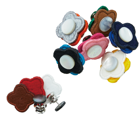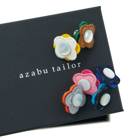 ジャケットのラペルにあるフラワーホールにあしらうアクセサリー。花型のフェルトを2枚重ね、貝のピンを刺すことで完成する。スタイリングや気分に合わせて、好みの配色で楽しんで。