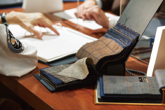 今回はスーツではなく上下別生地のジャケパンをオーダー。素材も柄も異なるこだわりの一着の仕上がりに、乞うご期待。