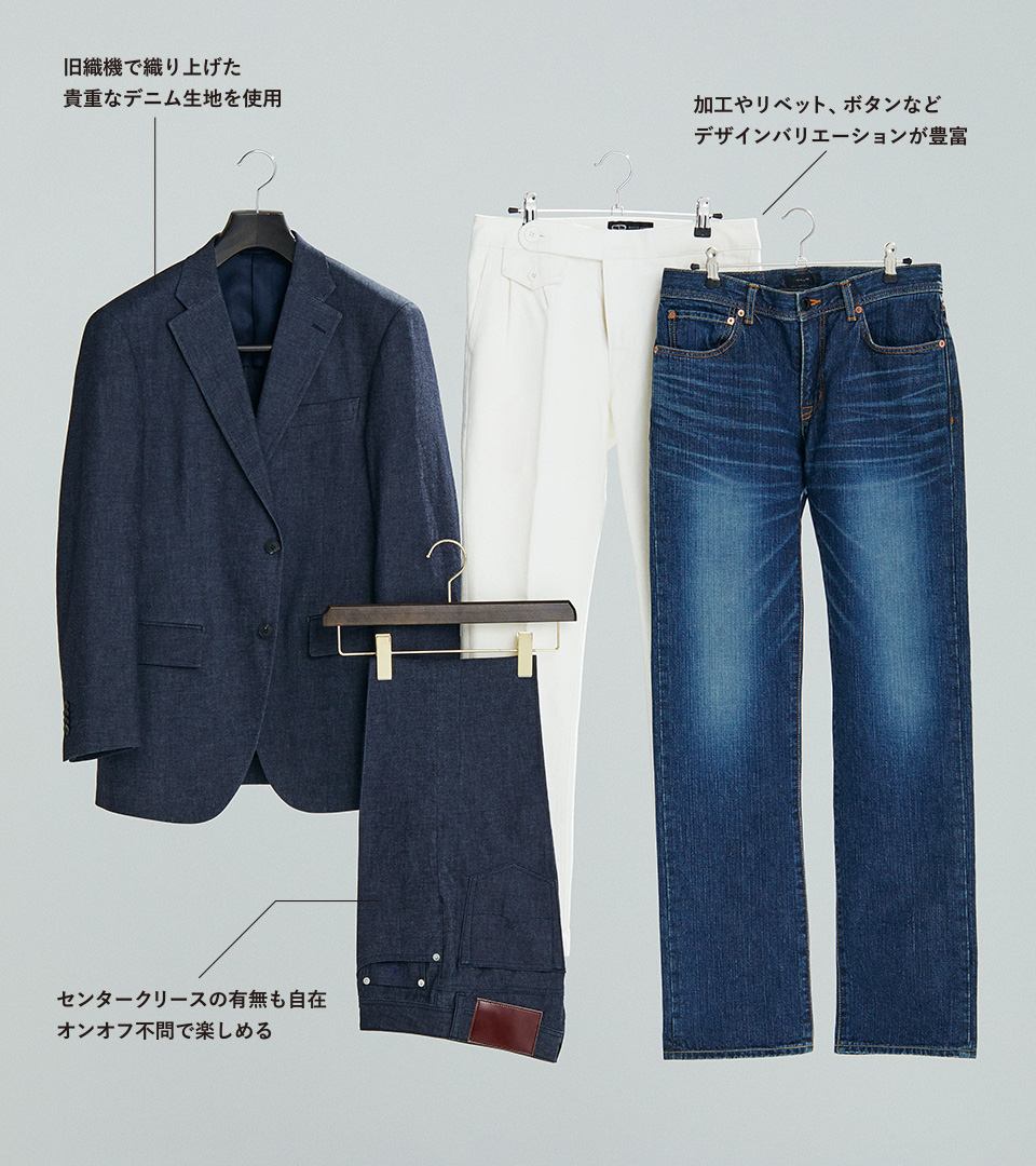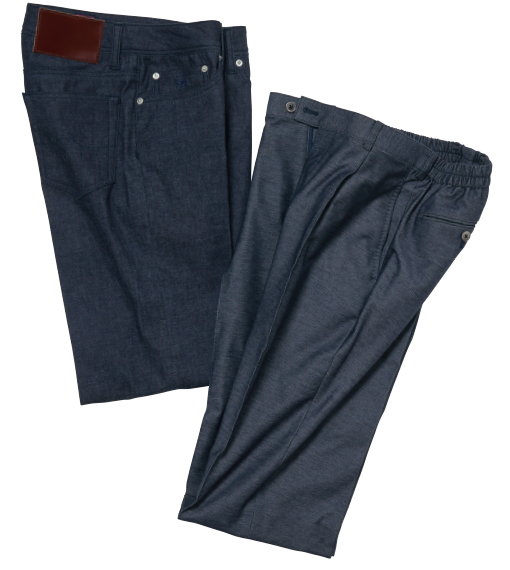 デニムの聖地として世界的に有名な岡山県倉敷市。その地で最古のジーンズファクトリーと協業して製作したデニムコレクションはまさにワールドワイドに通用するクオリティ。ストレッチデニムや色落ちしないデニムなど選べる生地は約50種類。自分史上、最高のデニムを今こそ。