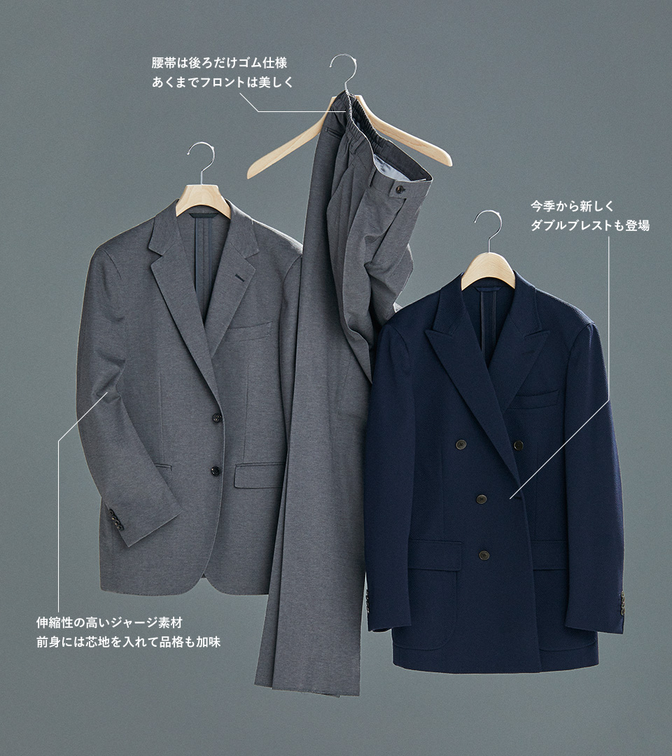 快適さは今や必要な要素。それに伴いジャージー生地が市民権を得ているが、見た目までイージーになってしまっては意味がない。その点、麻布テーラーが提案するジャージーセットアップは、ドレス然としたルックスが絶対条件。美しさに妥協はない。