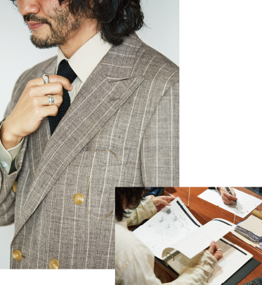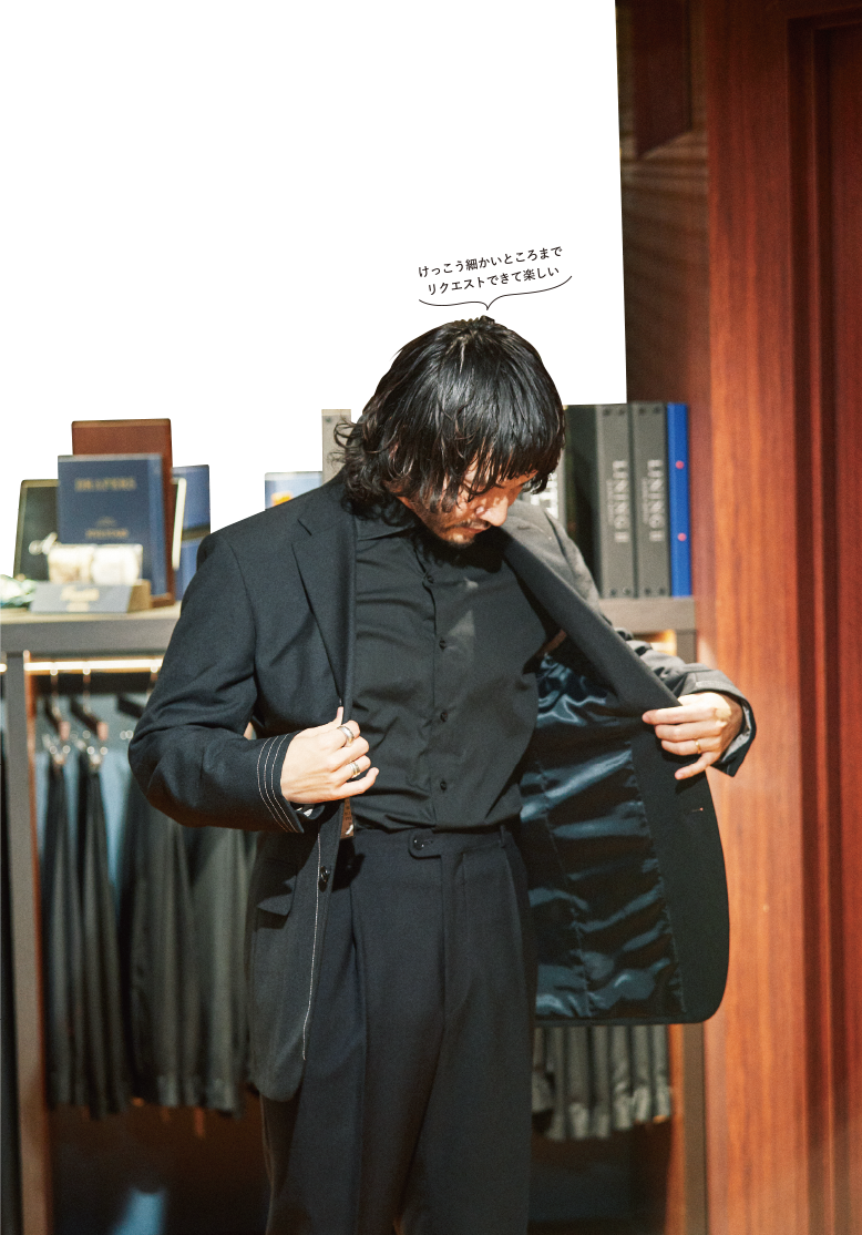 「今回僕がオーダーしたかったのは実用的なスーツではなく、ここぞというときに着たくなるような本気のスーツ。日本人はおしゃれをするためのスーツを持っている人が少ないと思うんですが、今回はそれを作ってみたいと思い、あえて着丈を長く胴まわりにゆとりを持たせてオーダーしました。結果は想像以上。シルエットも着心地もディテールも大満足。これを着て出かける日が待ち遠しいです」