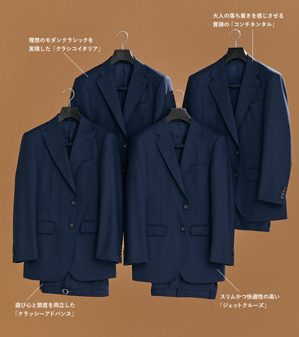 今季は既存の3モデルに加え、より趣味性の高いクラッシーアドバンスがハウスモデルに登場。今まで以上にパーソナルなリクエストに対応できるようになった。仕事もプライベートも価値観が多様化する現代。きっとこの中から自分に最適な一着が見つかるはず。