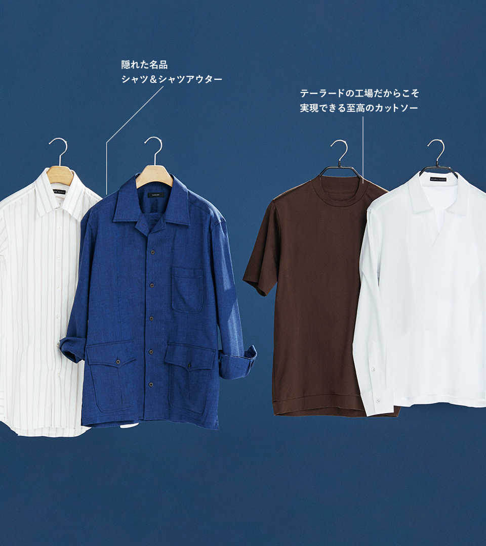 ドレスシャツはもちろん、シャツ生地のアウターもオーダーできる。シーズンで7万着販売する密かな名品だ。さらにカットソーもオーダー可能。うしろ襟が高めに設定されているためジャケットとの相性が抜群。テーラーファクトリーが作る着心地を、ぜひ堪能してほしい。