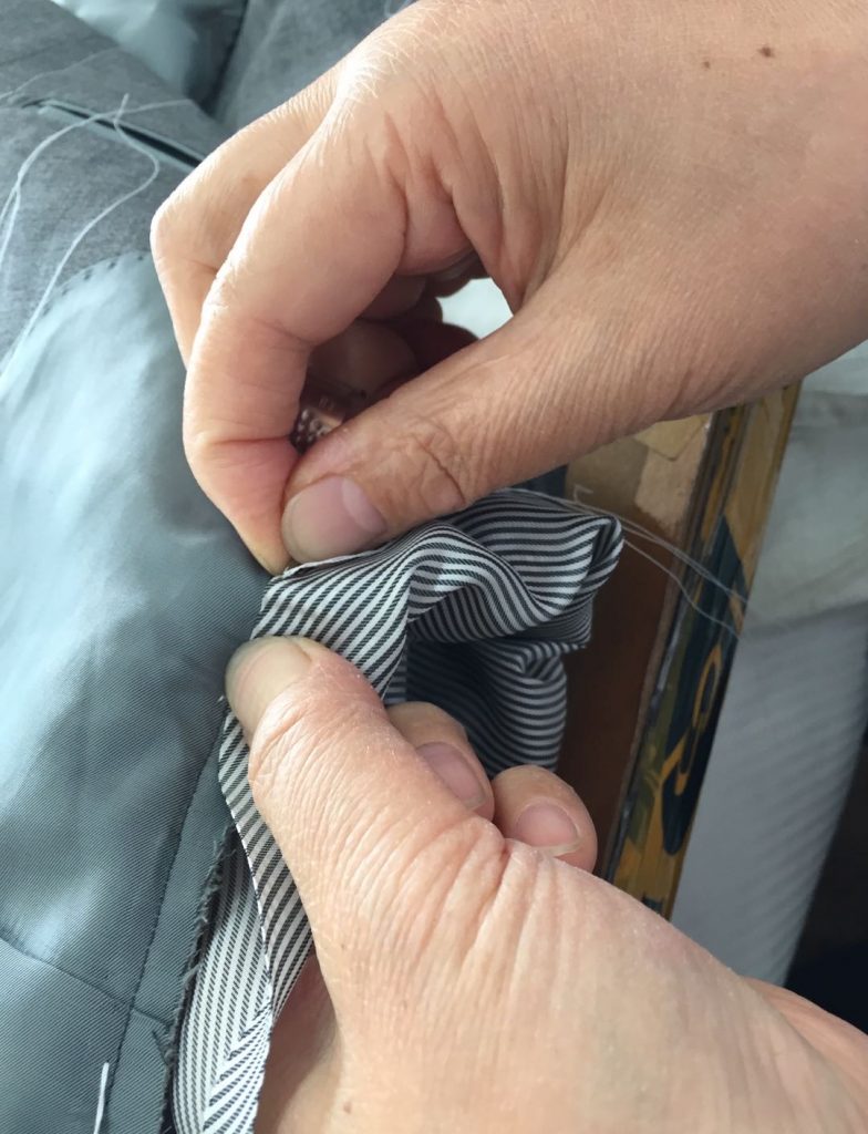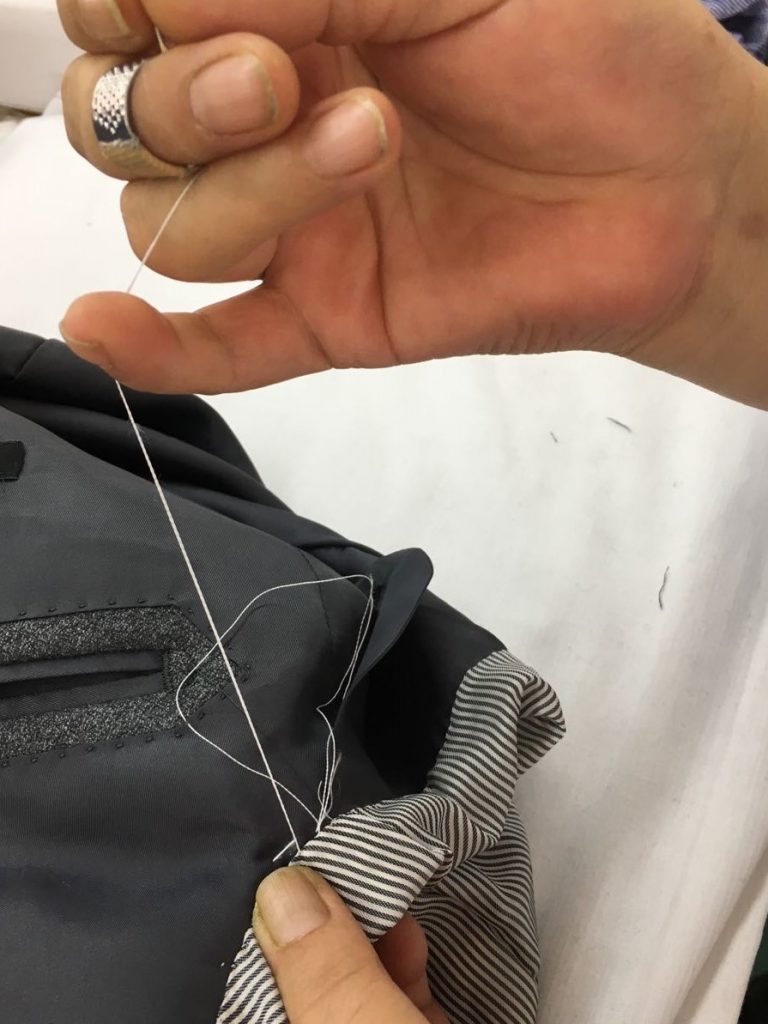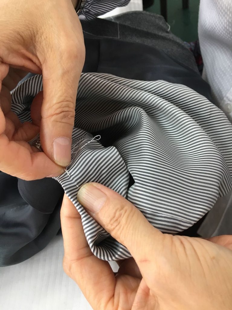 1着1着に合わせイセを入れ、手作業で強弱を付けながら裏地をまつり止め。