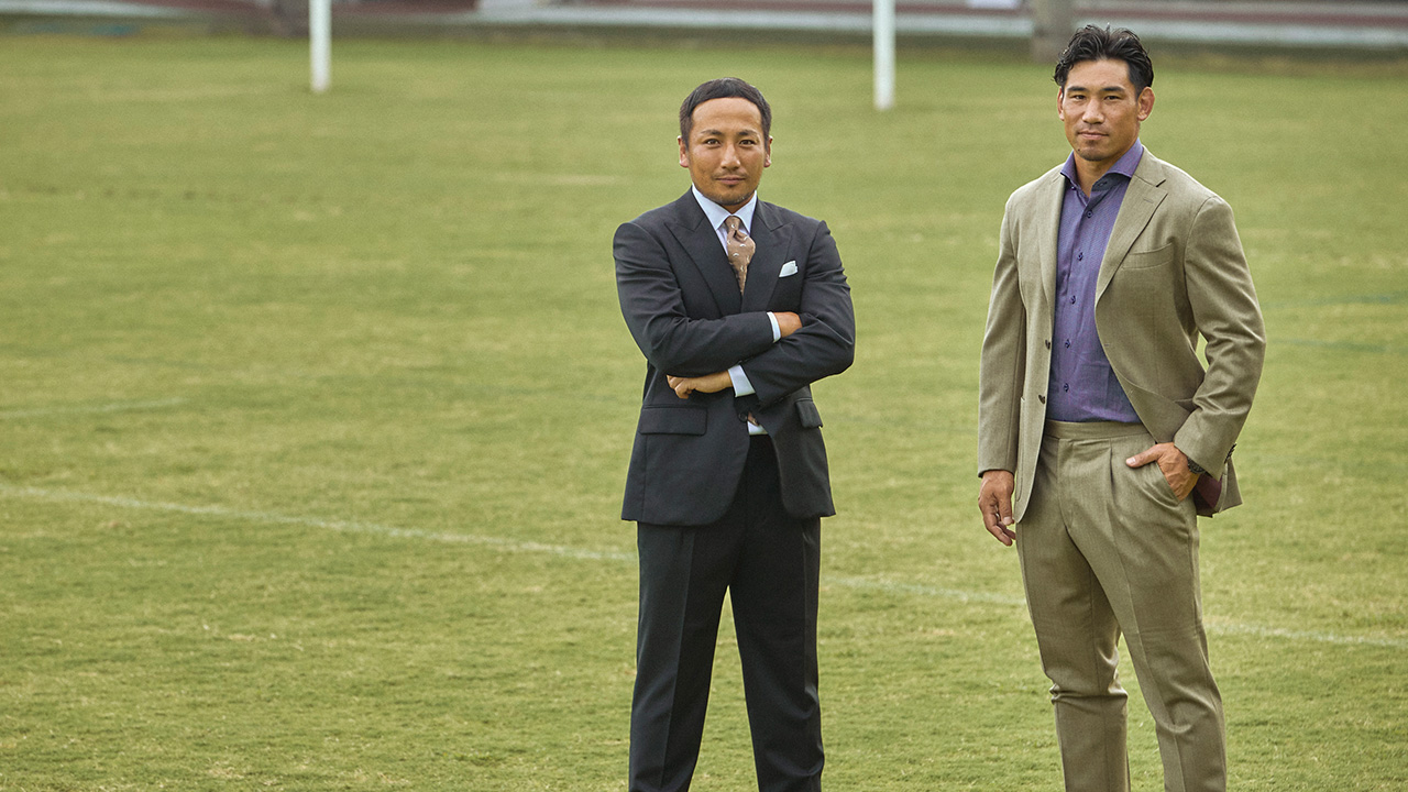 「麻布テーラーの人々」と題し、麻布テーラーと深く関係のある一線で活躍をされている方々にお話をうかがう本連載。今回は、ラグビーワールドカップ2019日本大会、2023フランス大会、両大会の日本代表選手として出色の活躍を見せた、流大選手と中村亮土選手、お二人のご登場です。日本代表を引退した現在も、引き続きリーグワン屈指のトッププレイヤーとして活躍中のお二人ですが、実は、これまでの選手生活を振り返ってみると、意外にもスーツとの関係が深い時期があったそうです。