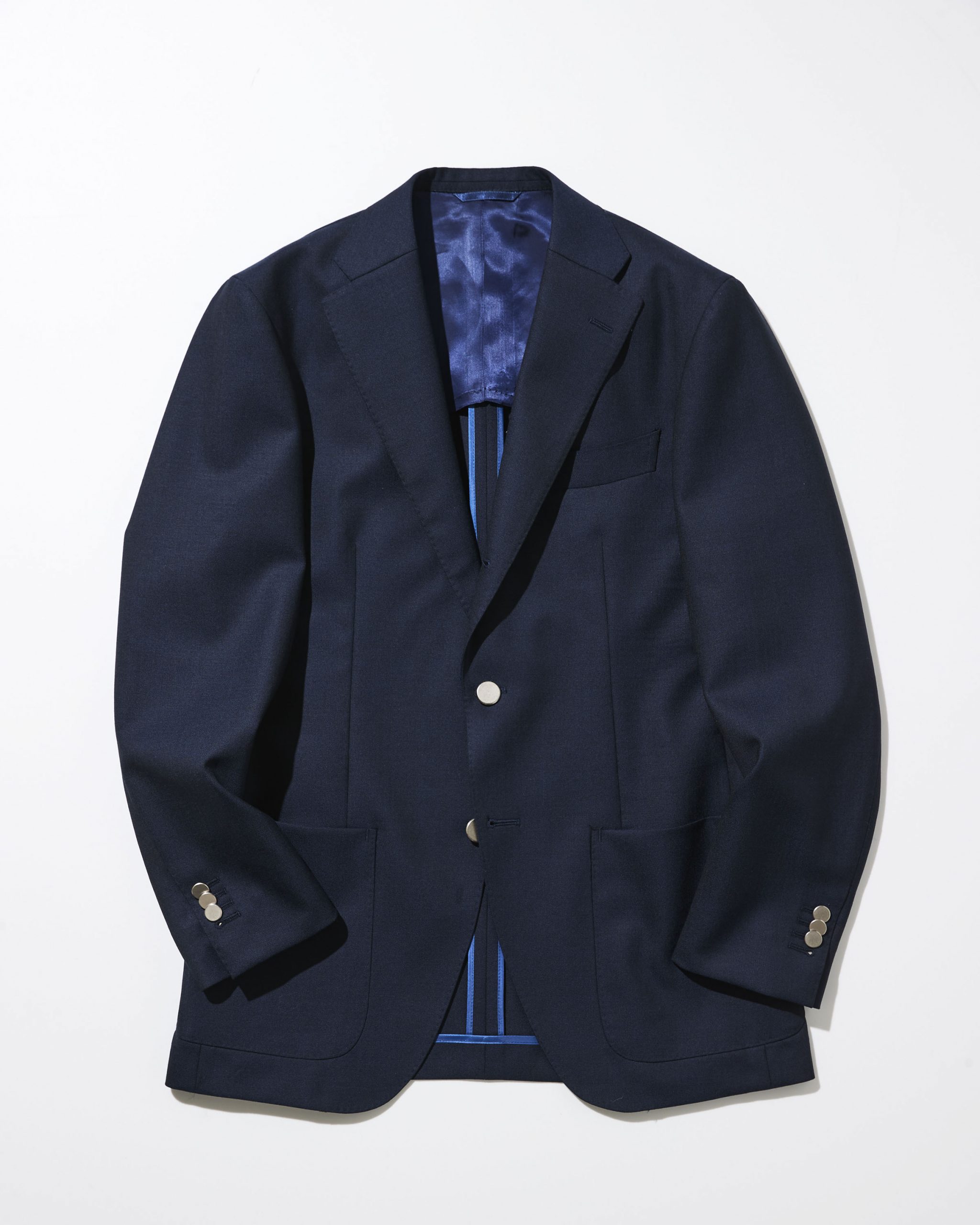 林:とても着心地いいですよ。この生地も気に入った。フニャッとしているかと思いきや、芯がしっかりあって、春夏にうれしいシャリ感もある。この生地なら着込むほど味も増しそうですね。色もいいな。濃紺だとフォーマル感が強くなってしまうと思って、淡いネイビーというか、ちょっと青みの強い色を選んだけれど、これも正解やった。