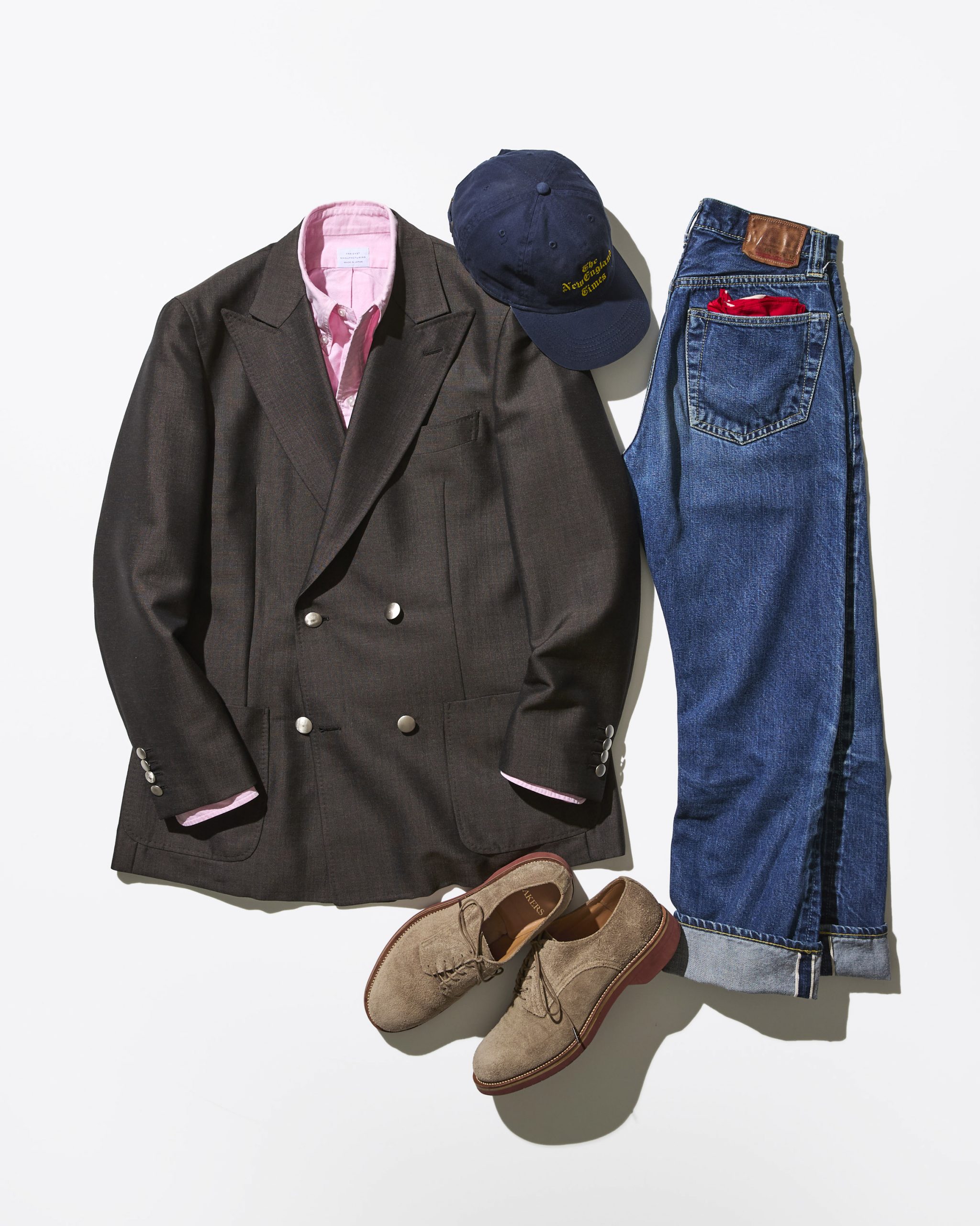 林:ブラウンのブレザーだから、シャツはピンク、ジーンズはブルーと、ともに相性のいい色合いを選んだんですわ。
