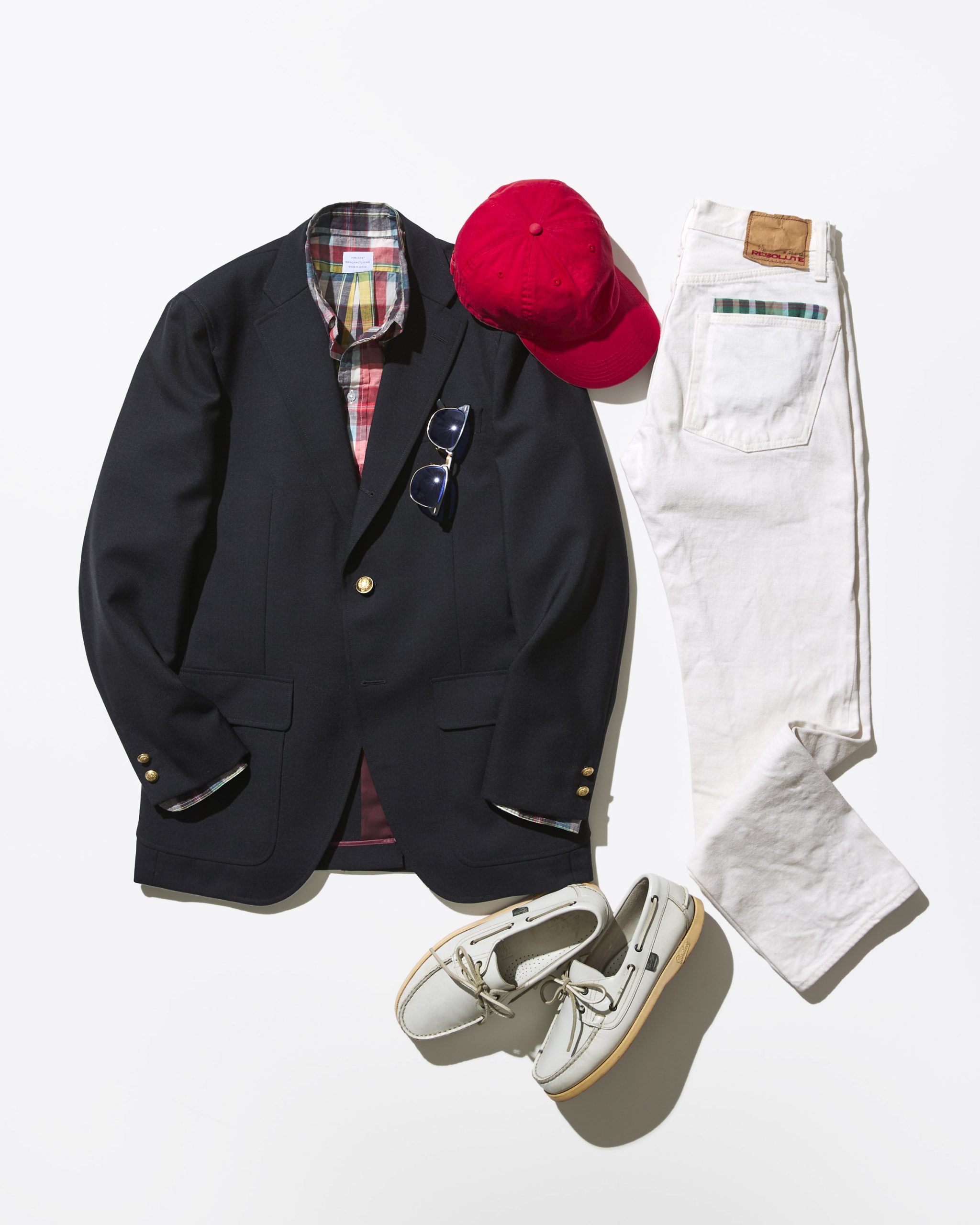 林:中にマドラスチェックのシャツを着て、リゾルトの白ジーンズとパラブーツの白デッキシューズを合わせました。ちょっとヨーロッパチックにまとめてみました。こういう着こなしのおっさん、港のカフェにいそうでしょ?