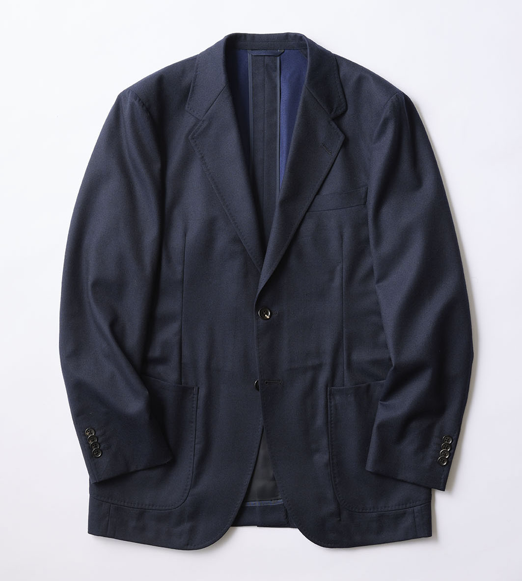 選び抜かれた16.5μの原料を使用した「MAFsuper140’s」のラグジュアリーな見た目のネイビージャケット素材。特殊な組織でタテ糸が表にヨコ糸が裏に出る彩度の奥深さのある表情が、制服化しない、都会で着るネイビージャケットの秘訣です。