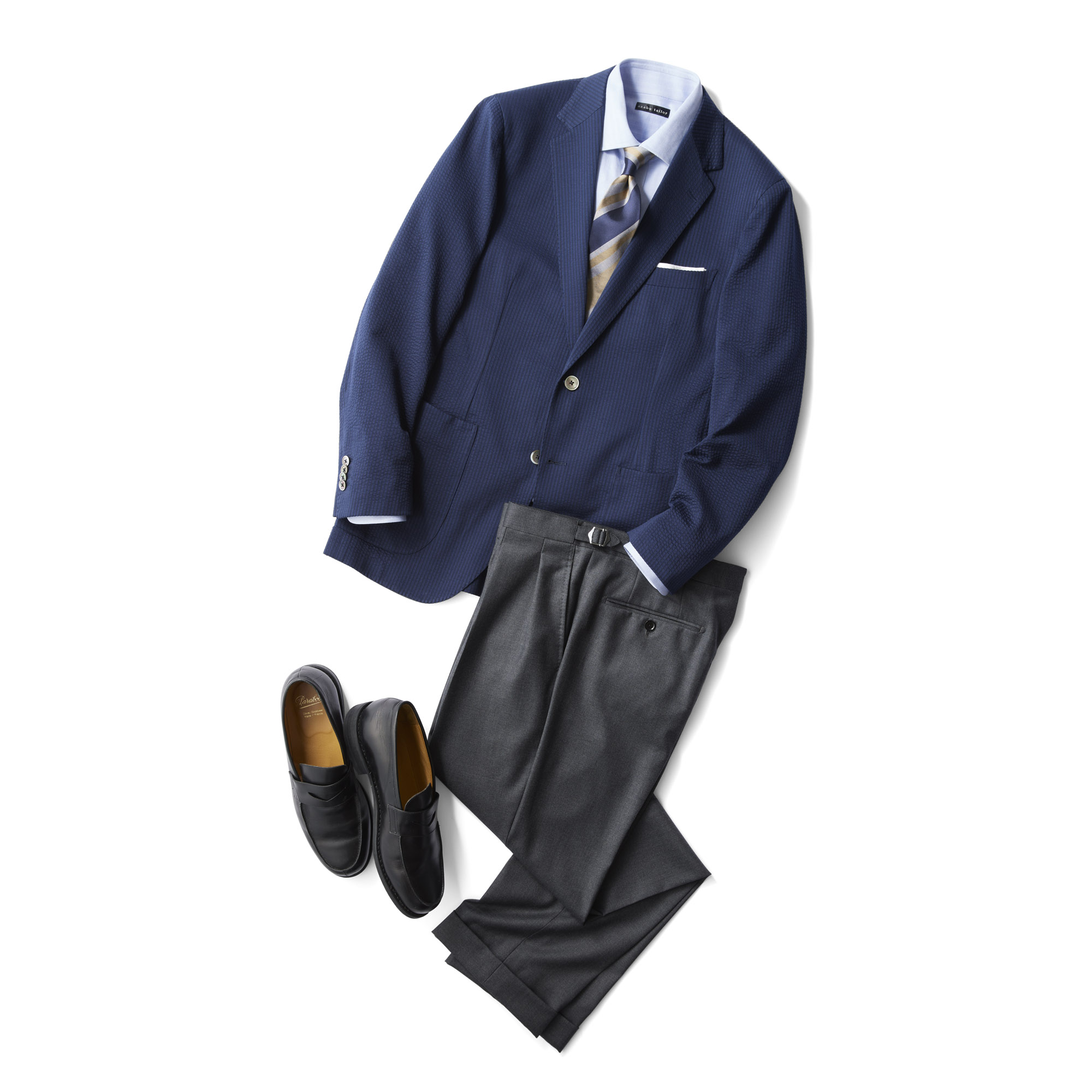 ビジネスシーンはもちろんのこと、カジュアルシーンにも対応できる、上質なジャージー素材だけを厳選しています。また、デザインだけでなく、着用シーンに応じた仕立ての選択もできるので、お客様のスタイルにマッチします。キチンと見えるのに「着こなし」がとっても楽ちんな秘密は、素材とデザインと仕立ての掛け合わせにあります。【F42089】シングルジャケット¥55,000+水牛釦¥3,850/パンツ¥27,500+シャーリング¥3,300