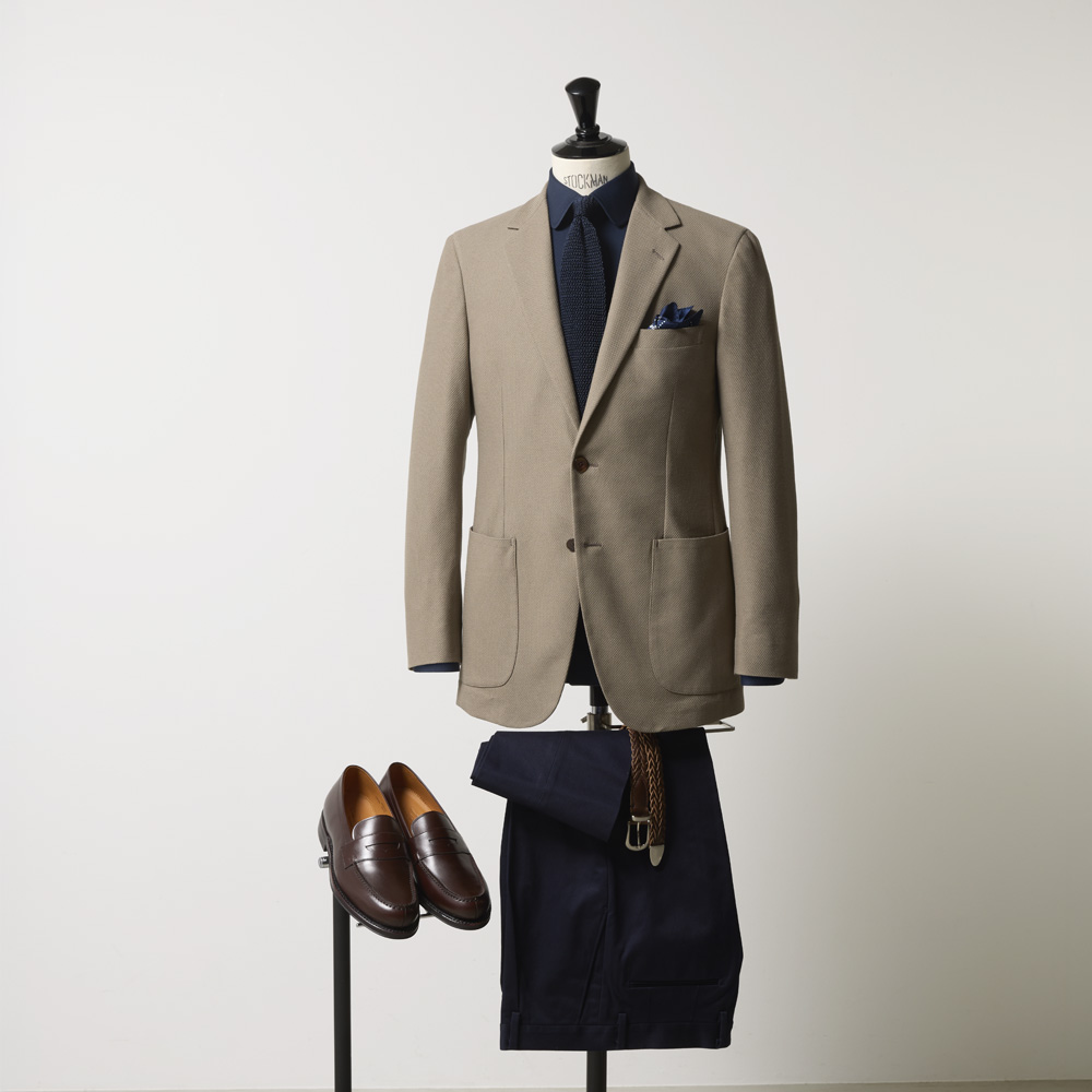 立体構造により軽量で、通気性・吸水性・速乾性に優れた夏向け素材。リネン混ならではの豊かな表情も魅力です。防シワ性とストレッチ性を備えたベージュジャケット。上品な組織感の中に程よいラフさを持ち、大人の余裕を演出します。オーダージャージージャケット¥44,000+貝釦¥3,850【HONEYCOMB LIKE JERSEY F62140】