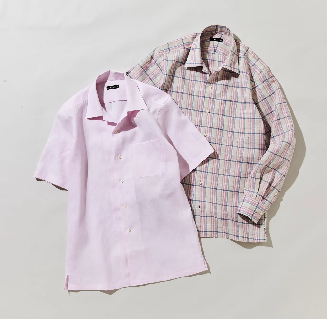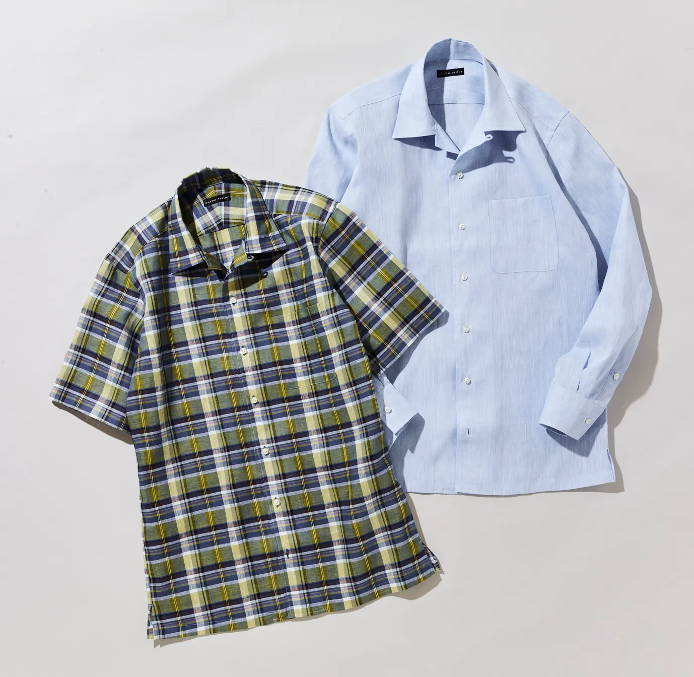 麻布テーラーのオープンカラーは、アメリカで誕生したボーリングシャツやハワイアンシャツなどのオープンカラーとは違い、現代的な抜け感と構築的な美しさを兼ね備えたデザインを目指しました。一番上の釦を閉じても外しても美しく決まる設計で、後中心に三日月型の台衿を配することで、釦の開閉にかかわらず襟がベタつかず、立体的なフォルムを保ちます。釦止めとループ止めも選択でき、春のジャケットのインナーとしてロングスリーブに、夏のパンツスタイルにはハーフスリーブとコーディネートの幅も広がります。