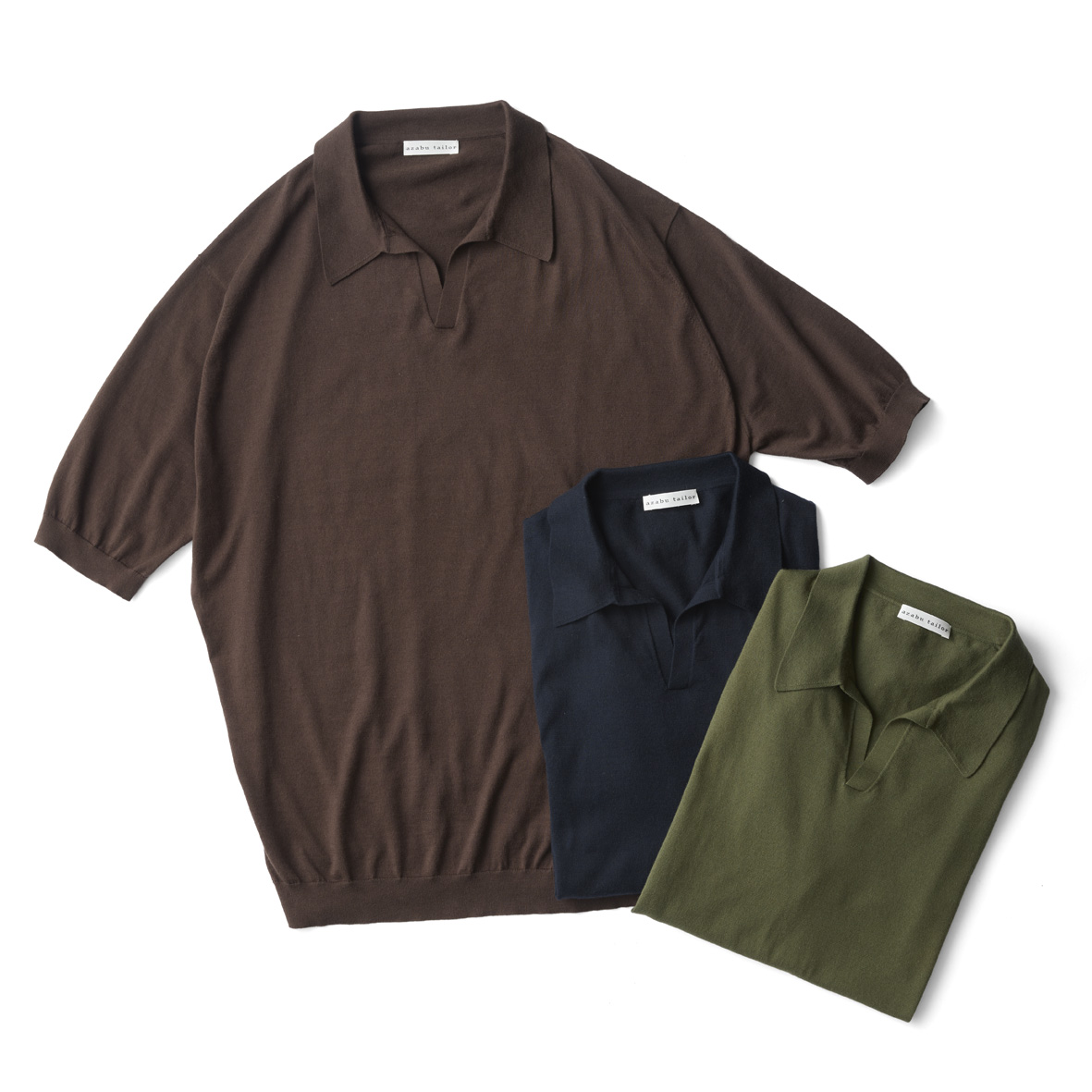 昨年好評を博した、アメリカン・シーアイランドコットンを使用したニットポロが、今季はトレンドのスキッパーカラーで登場。“奇跡の綿花”とも称される超長綿を18ゲージで度詰めに編み立て、なめらかな肌触りと上質な光沢を実現しました。衿元は自然な立体感を持たせた設計で、ジャケットのインナーとしても美しく収まり、一枚でも端正な印象に。ホームウォッシャブル仕様で実用性も備え、夏のセットアップスタイルに軽快な抜け感を添える一着です。
