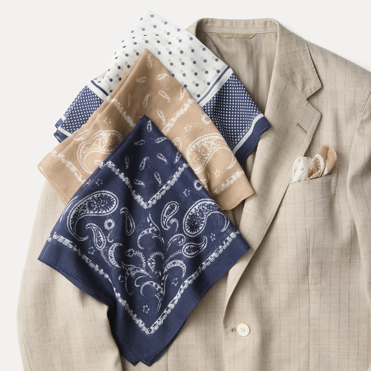 イタリア製の薄手ファブリックを使用した、春夏に最適なネッカチーフ。コットンとシルクをブレンドした素材はドライタッチで、さらりとした肌触りが魅力です。デザインは、ペイズリー柄とドット柄の2種類を展開。ネイビー系とベージュ系のカラーリングで、落ち着きの中に程よいアクセントを添えます。53cmスクエアのサイズは、首元に巻くネッカチーフとしてはもちろん、ポケットチーフとしても使用可能です。