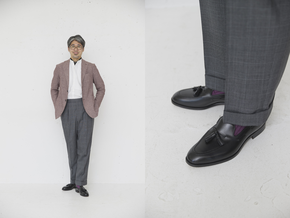 村井:ノータイのややくつろいだジャケットスタイルなので、こういうローファータイプの靴が合うのかなと。タッセルローファーにしたのは、房飾りのアクセントが、スラックスのグレンチェック柄の小粋さとマッチするんじゃないかと思いまして。