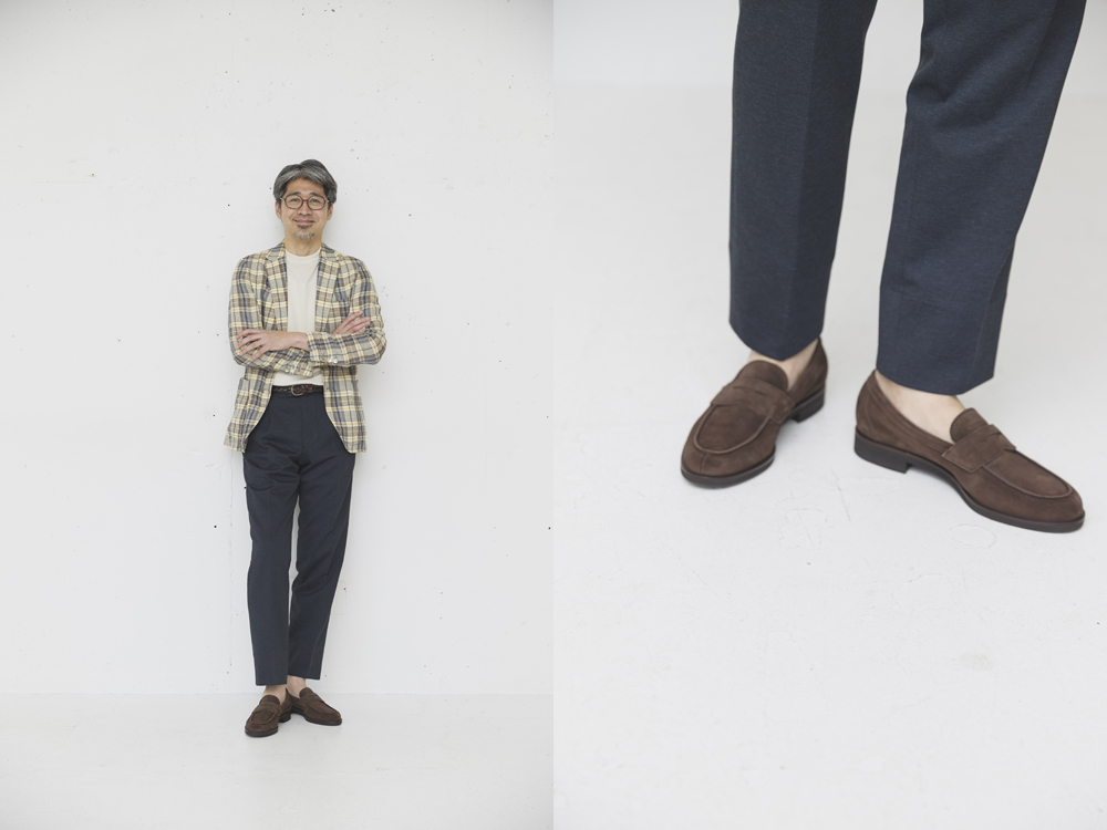 越智:お履きになっているのはダークブラウンのスエードローファーは、トレーディングポストのオリジナル。これも最初に紹介したパンチドキャップトウ同様の全天候型モデルで、アッパーにイタリア製の撥水スエードを使用したものですね。