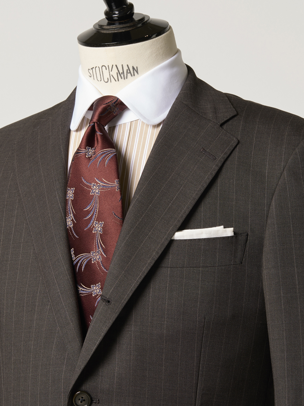イタリアのMarlaneによる「VIVO」。強撚双糸が生む反発力とドライなタッチが特徴です。ブラウンストライプがクラシックを軽快に更新し、発色の美しさと仕立て映えするハリ感を実現。躍動感ある着心地を楽しめる春夏素材です。◼︎オーダースーツ ¥71,500【M62800】+水牛釦¥3,850