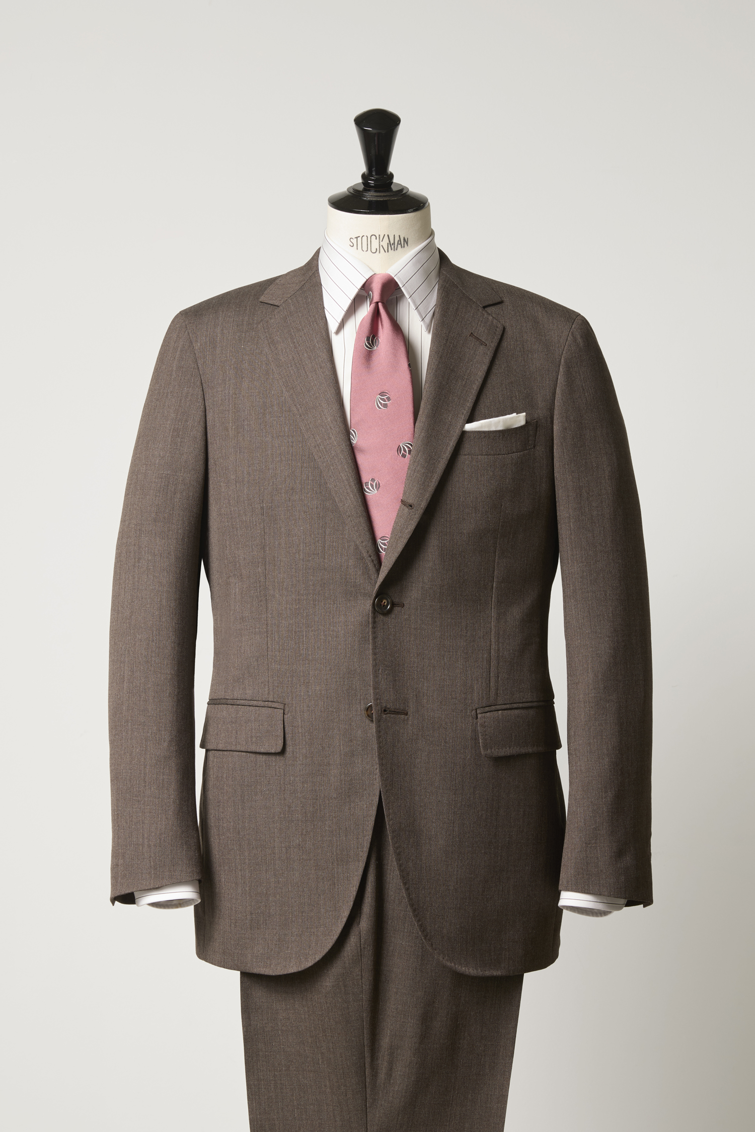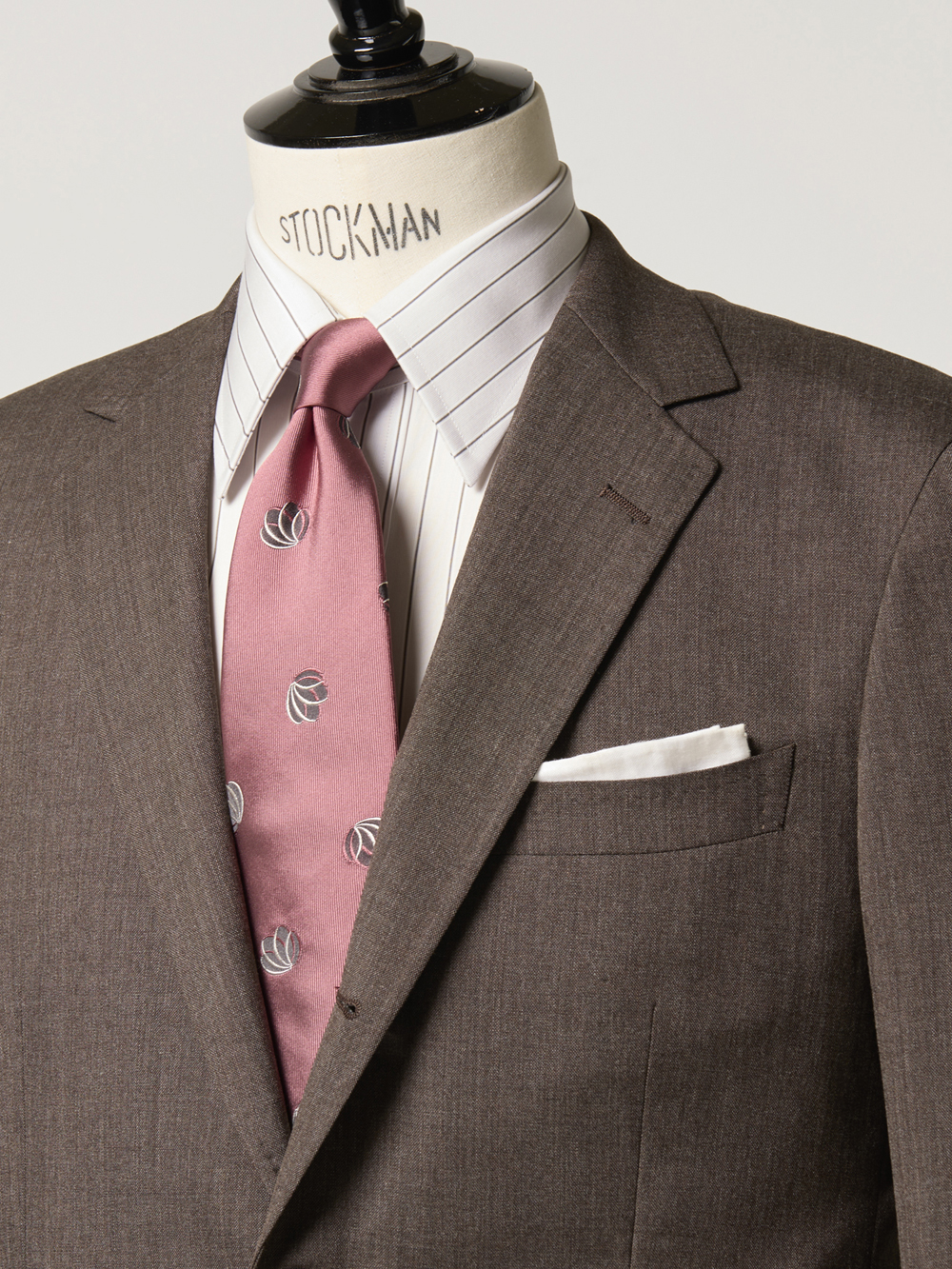 尾州産ウール100%を使用。しなやかな風合いと自然な光沢が、春夏でも品格ある佇まいを演出します。身体の動きに沿う弾力が立体的なシルエットを支え、軽やかでありながら構築美を損ないません。ブラウン無地はセットアップ対応で着回しも自在です。◼︎オーダースーツ ¥49,500【A52908】+水牛釦¥3,850