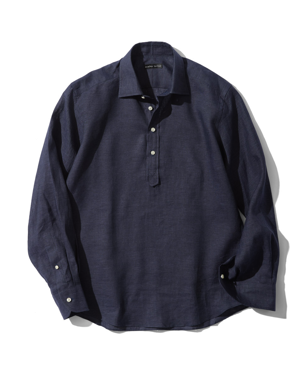「リネンのロールスロイス」とも称されるノルマンディー地方産のHerdmans(ハードマンズ)リネンを使用。先染めで無地7色、ストライプやチェックまで幅広いラインナップを展開しています。リネン素材には、程よい抜け感があるプルオーバーもおすすめです。小ぶりなワイドカラーにするだけで、ビズポロ感覚の上品さも漂います。