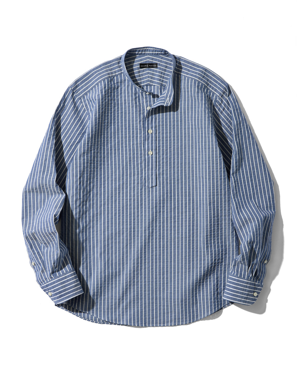 Made in SpainのSIDOGRAS(シドグラス)製の100%コットン シアサッカー素材。清涼感のある柔らかさ、インディゴ風の色合い、そしてドレッシーなストライプ柄が魅力です。プルオーバーのバンドカラーで仕立てれば、洗いざらしでラフに、ジャケットと合わせて上品にと、多彩なスタイルに対応します。