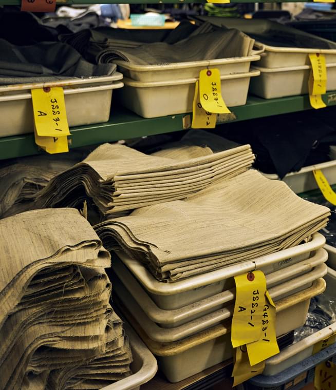 オーダースーツブランドはいまや数えきれないほど存在しますが、自社工場で服作りを行っているのはごくわずか。そのひとつが麻布テーラーで、現在は滋賀県と広島県の2カ所に拠点を構えています。今回紹介する滋賀工場は創設1969年。その歴史は半世紀以上に及びます。最大の特徴は、生産量の99%がオーダー服であるという点。同じ仕様の服をまとめて作る既製服工場とは違い、仕立てる洋服の一点一点がすべて異なるのです。それらをミスなく、かつ品質にもこだわって仕立て上げる秘訣は何か? それは、手間暇を惜しまない職人魂、そして約150人の技術者たちが一丸となって一着を仕立てるチーム力にあります。次ページから具体的に見ていきましょう。