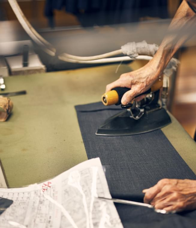 およそ300もの工程を費やして完成するスーツ。パンツの生産を外注する工場も多いなか、麻布テーラーではすべてを自社一貫製作しています。要所となるところには手縫いも用い、本格派の仕立てを継承。