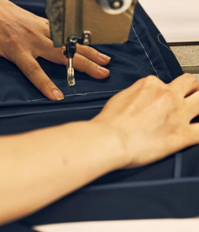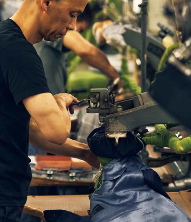 昔ながらの手仕事を堅持する一方、必要とあらば先端テクノロジーも柔軟に取り入れる。クオリティーを効率的にアップすることができれば、固定観念をもつことはありません。写真は、身頃の内側を正確無比に縫い上げる最新機械。これによって、ファクトリーのパフォーマンスは一段と向上しました。人機一体。適材適所。そんな哲学を掲げながら、創設半世紀超のファクトリーは日々アップデートを重ねているのです。