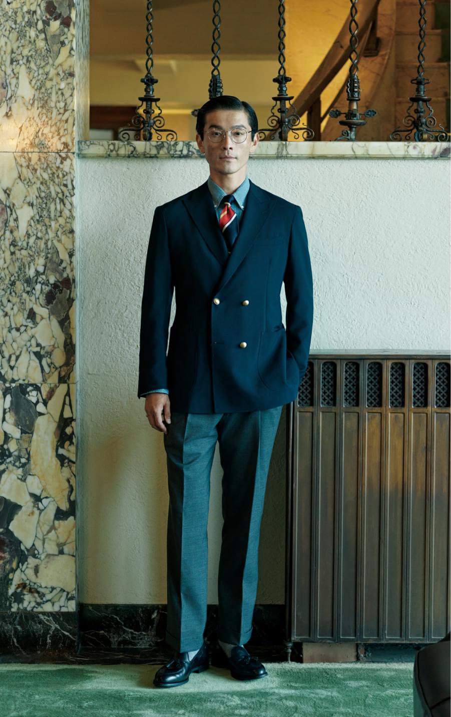 フロントはマットな輝きを放つメタルボタンでエレガントに。知的さ漂うアイビースタイルです。