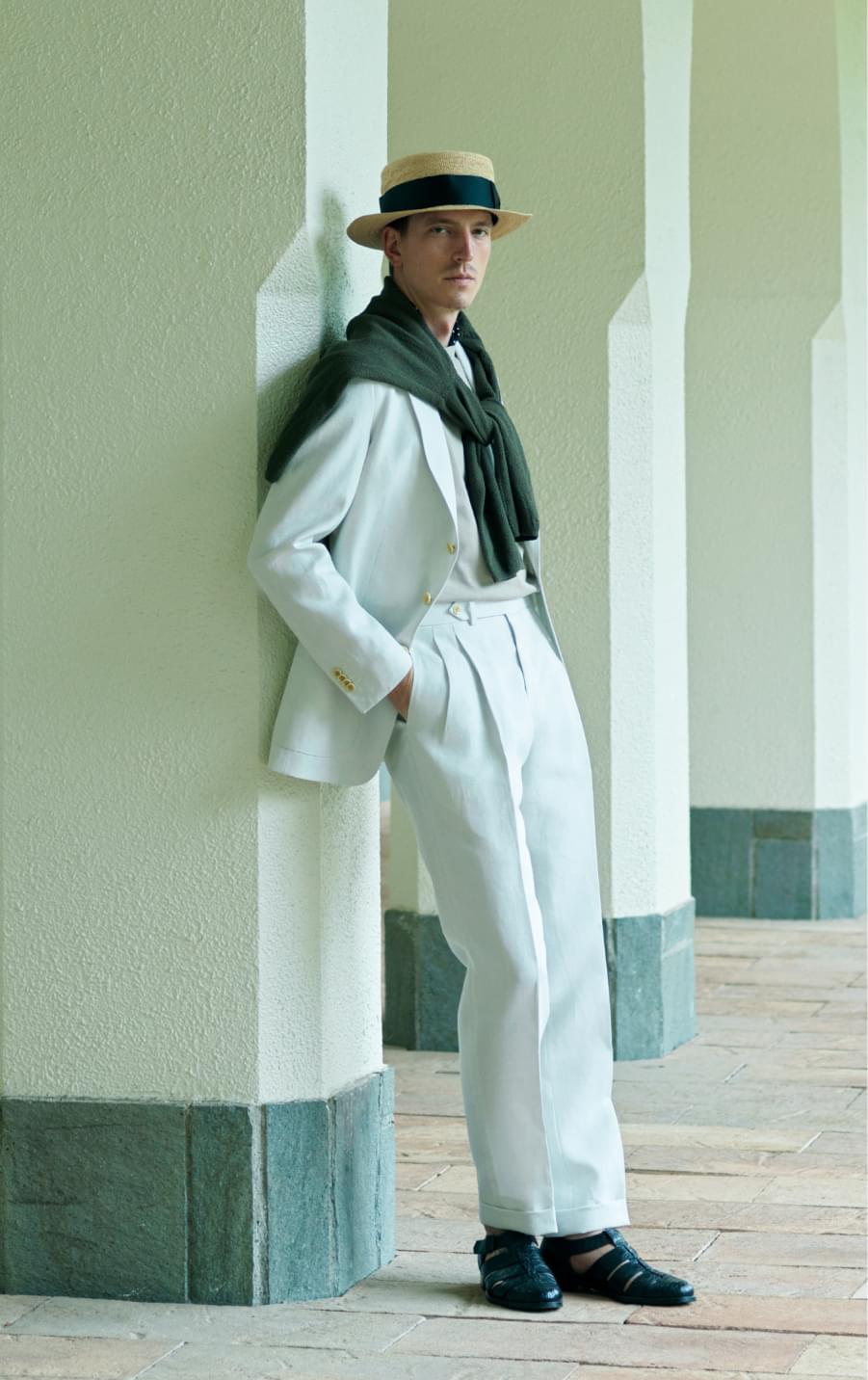 爽やかなアイボリーかつ上質な手触りのリネンスーツが、色気と上品さを創出。