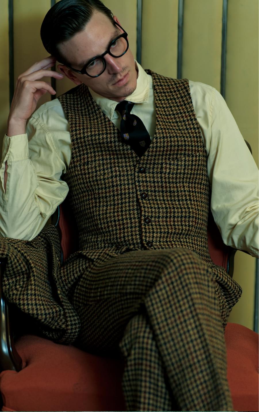 ハリスツイードを使ったガンクラブチェックのベストは、レザーのくるみボタンに加え、胸と腰に2つずつ、計4つの箱ポケットを設け、アウターとしても映える仕立てに。イエローのオックスフォードシャツとクレストタイで秋冬らしいトラッドが完成。