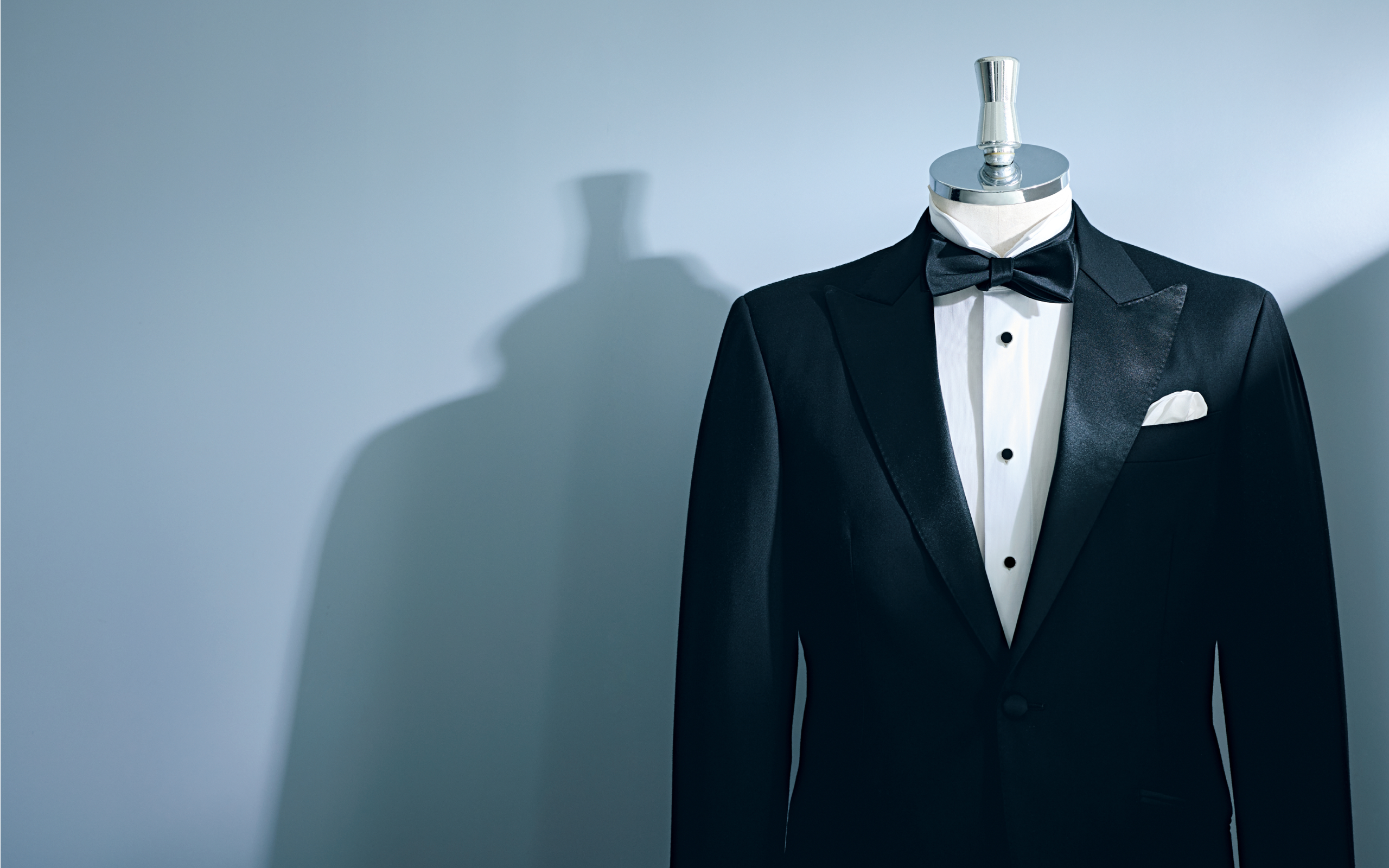 フォーマルの装いはまず昼夜によって大別され、格式によって正礼装(Formal)、準礼装(Semi Formal)、略礼装(Informal)の3種類に区分されます。昼の装いで最も格式の高い正礼装は、着丈が膝上まであるモーニングコートに黒とグレーのストライプ地で折り返しのない特徴をもつコールパンツ、シルバーのベストという組み合わせ。国家式典にも通用する装いですが、身近なところでは結婚式の主賓や媒酌人、新郎新婦の父が着用します。