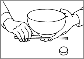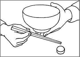 左から、皿の上で箸をうろうろさせる「迷い箸」、箸で器の中を掘り起こす「探り箸」、皿の上に箸を渡して載せる「渡し箸」、箸から箸へ食べ物を渡す「移し箸」。