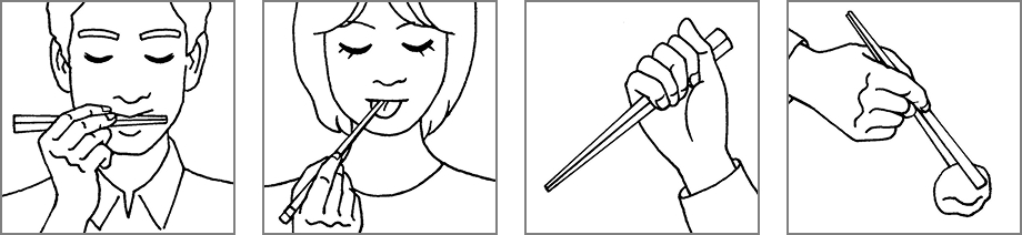 左から、箸についた食べ物を口で取る「もぎ箸」、箸先をなめる「ねぶり箸」、箸を握り締める「握り箸」、大皿から料理を取るとき、箸の上下を逆さにする「返し箸」。