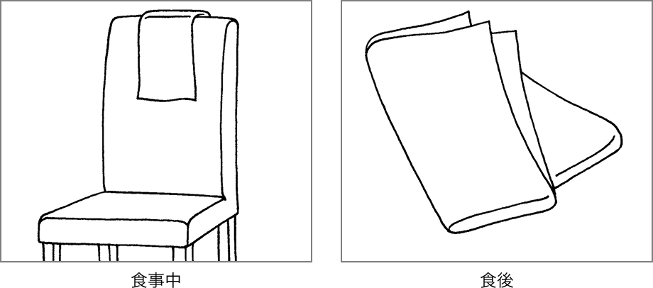 食事中に席を外すときは椅子の上にナプキンを置きますが、座面に置くのが衛生的に気になる場合は背もたれにかけるとよし。食事を終えたら、ざっくりと畳んでテーブルの左側に置きます。