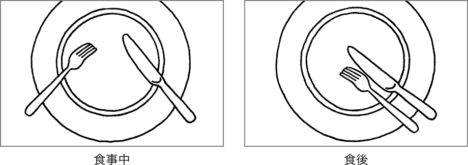 食事中はナイフ・フォークをハの字になるように置き、食べ終わったら右下にそろえて置きます。皿の上に料理が残っていても、食事を終えたサインになります。