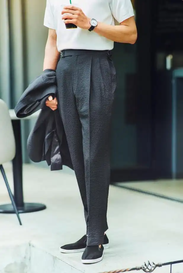 夏場のスラックス、一日穿いて汗を吸ったのに洗わずまた穿くって、やりがちながら不衛生ですよね。かといって“洗える”を標榜するそれは大抵が品格の面でもの足りないし……。そんなジレンマを鮮やかに解決してくれるのが、麻布テーラーのウォッシャブルパンツ! 完全自社生産となった新型は、調整の自由度がさらに増すとともに、1万6500円からのオーダーが可能に。より身近な存在になった♡とあれば、詳報せぬわけにはいきません。写真のパンツは、ウール×ポリエステルからなるシアサッカー生地を用いたもの。ウールベースゆえの上品な艶&オーダーならではのすらりと脚をなぞる美しいシルエットを見れば、まさかこれがウォッシャブルだなんて思いも寄らないでしょ? センタークリースが消えづらいよう工夫を凝らすなど、イージーケアを追求しているのも嬉しいところ。つまり麻布テーラーの洗える夏スラなら、何を犠牲にすることもなく“品”と“清潔”を両得できるのです♡ これぞ夏場も常に品行方正でありたいドレス好きにとっての最適解ってこと、納得していただけました?