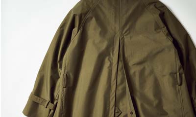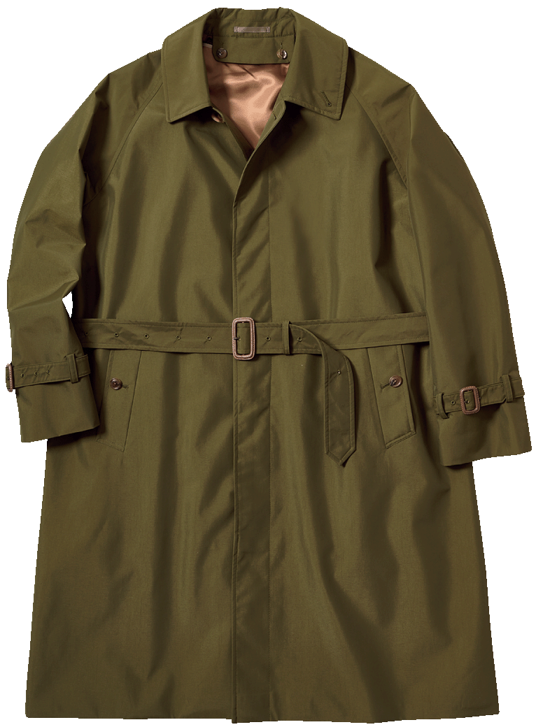 デコラティブな意匠を削ぎ落とし、モダンな顔立ちに仕上げたトレンチ。防水透湿生地を使用することで、天候不問の一着に。納期4週間〜(共通)。9万7350円〈オーダー価格〉。