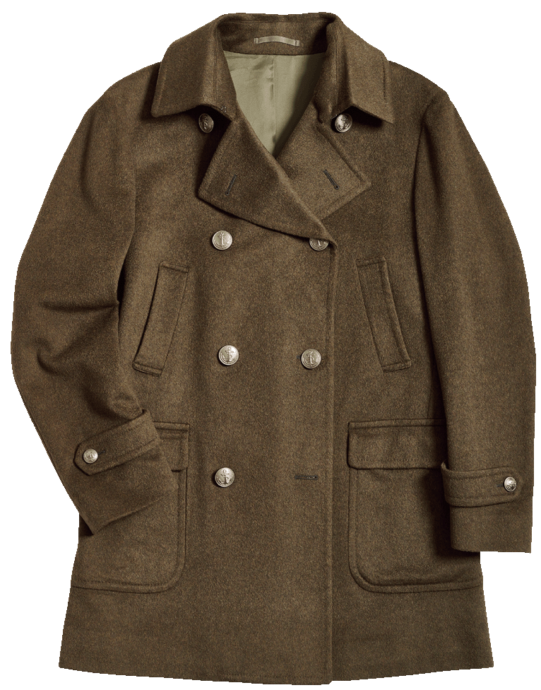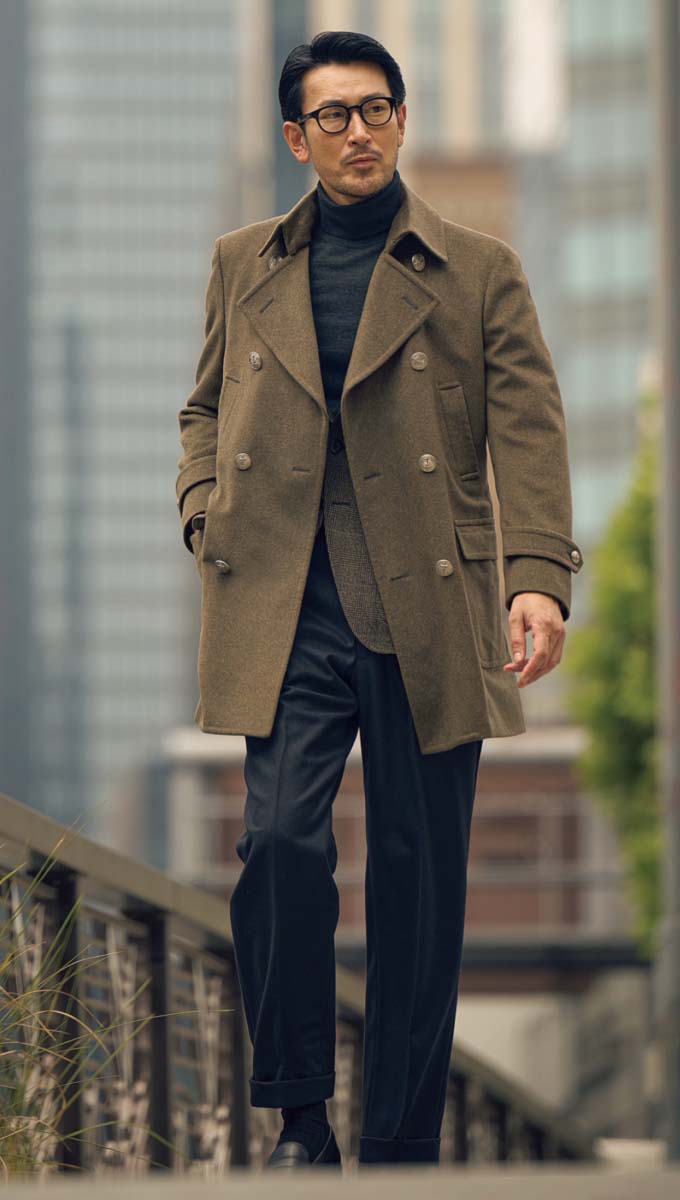 ジャケットの裾が隠れる着丈、端正なウエストシェイプを特徴とする、ドレス仕様のピーコート。衿周りの美しさも、まさにドレスの名に相応しい。14万6850円〈オーダー価格〉。