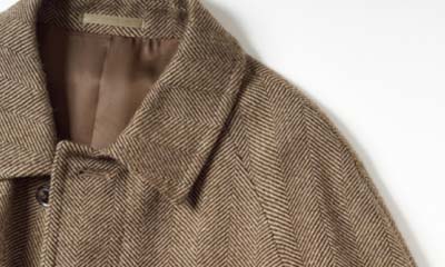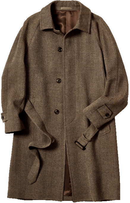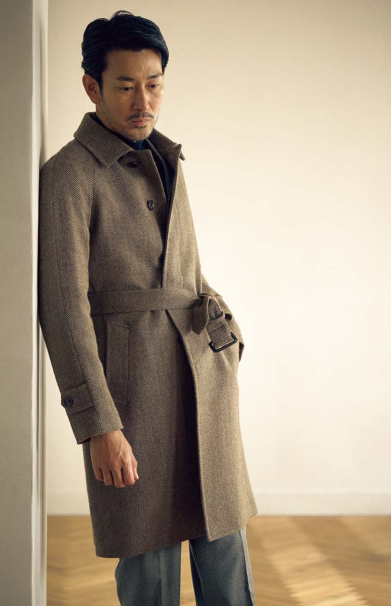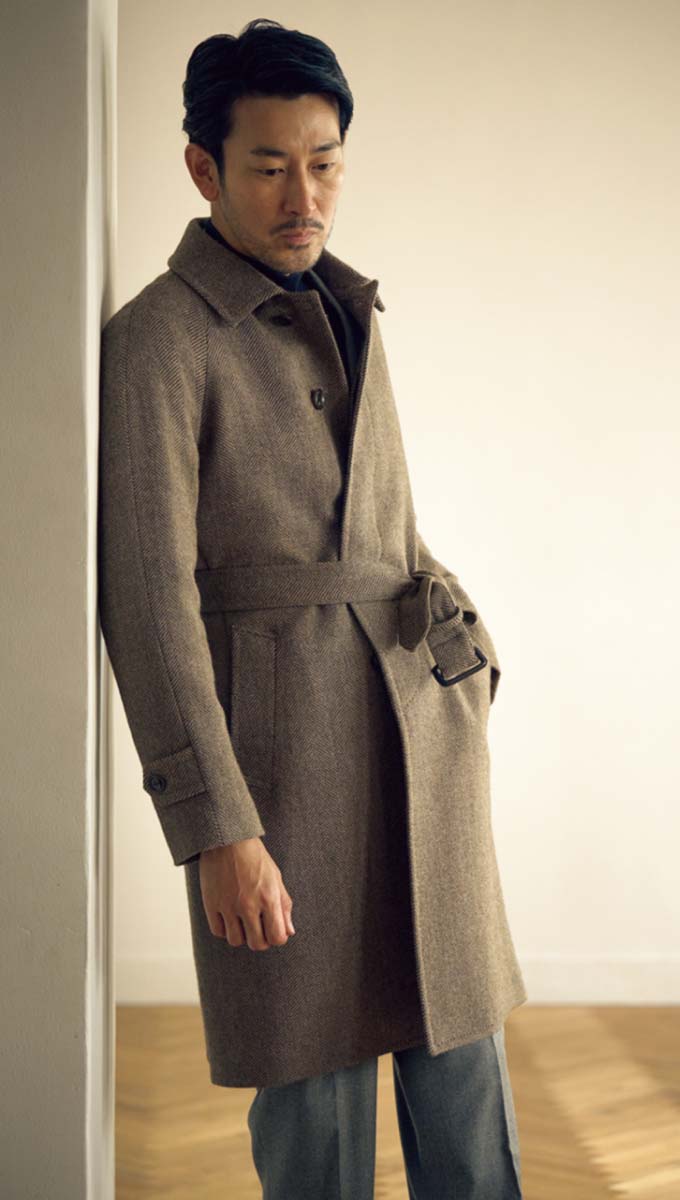 シングルの比翼コート。伊・アンジェリコ社製のビッグヘリンボーン生地はざっくりとしたタッチで、ウエストをベルトで絞れば、味なドレープが楽しめる。オプションでダブルの選択も可能だ。8万4150円〈オーダー価格〉。